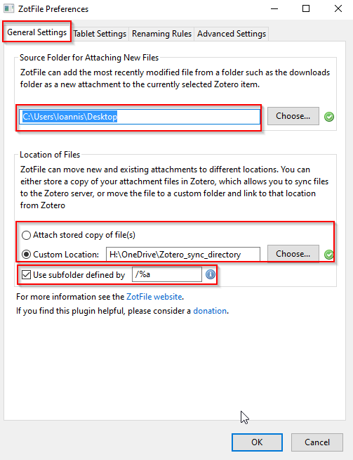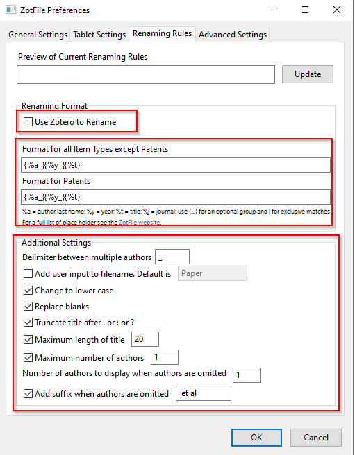 Ακολούθως στην καρτέλα Renaming Rules αποεπιλέγουμε το use Zotero to Rename και διαμορφώνουμε τις επιλογές όπως παρακάτω (χωρίς να είναι απαραίτητο να είναι ίδιες με αυτές που βλέπετε). Είναι σημαντικό όμως να είναι ίδιες μεταξύ των υπολογιστών που χρησιμοποιούμε και που συγχρονίζονται.