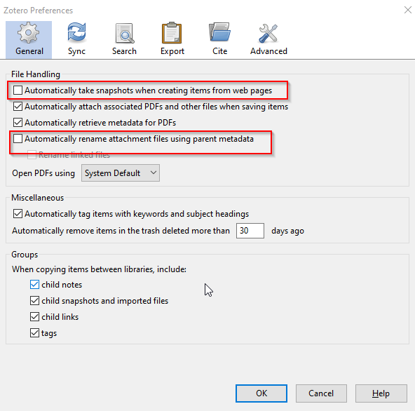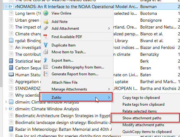Υπάρχει πιθανότητα να έχετε ήδη μια συλλογή από προηγούμενη χρήση του Zotero και μετά από τις νέες ρυθμίσεις να μη δουλεύει αφού έχουν αλλάξει τα paths. Τότε θα χρησιμοποιήσουμε το Add-on Zutilo. Το κάνετε εγκατάσταση όπως και με το Zotfile. Και πηγαίνετε στο Zutilo Preferences και ενεργοποιείτε όπως στην εικόνα τα show attachements και modify attachements