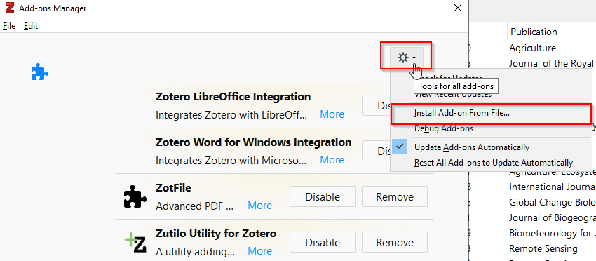 Βήμα 4: Αφού έχουμε ολοκληρώσει τα παραπάνω πρέπει να κατεβάσουμε και να εγκαταστήσουμε το add-on Zotfile. Πάμε στη διεύθυνση το κατεβάζουμε και μετά από το Tools>Add-ons